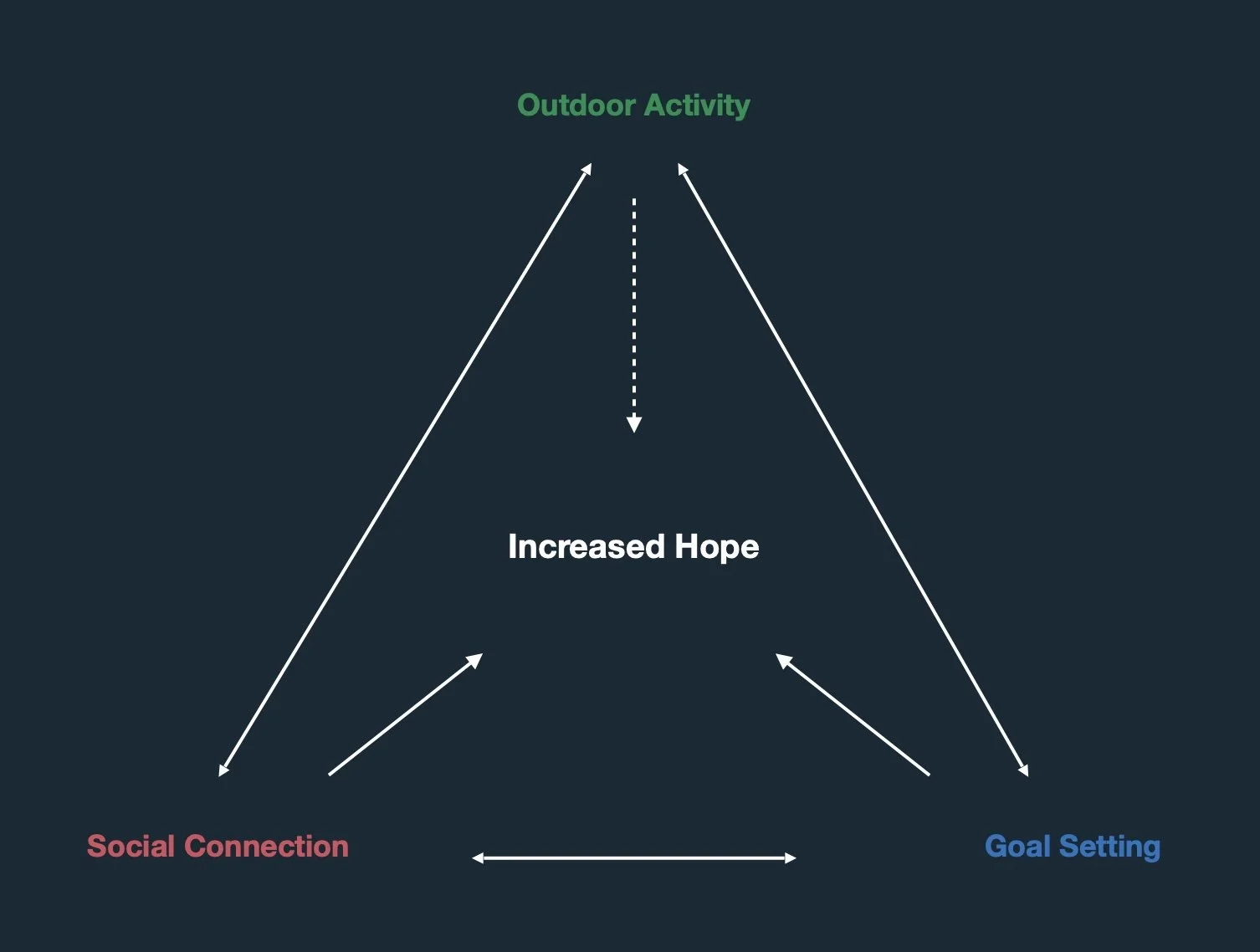 Our unique approach to cultivating hope in individuals with neurological conditions focuses on three key components: engaging in outdoor physical activity, fostering social connection and goal setting. These components interact with each other, powerfully increasing hope and other aspects of wellbeing.
